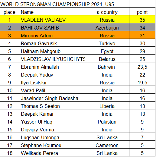 – among men in the U95 category, Vladlen Valyaev from Russia won (35 points), second place was Sahib Bahirov from Azerbaijan (34 points), third place was Artem Mironov from Russia (31 points);